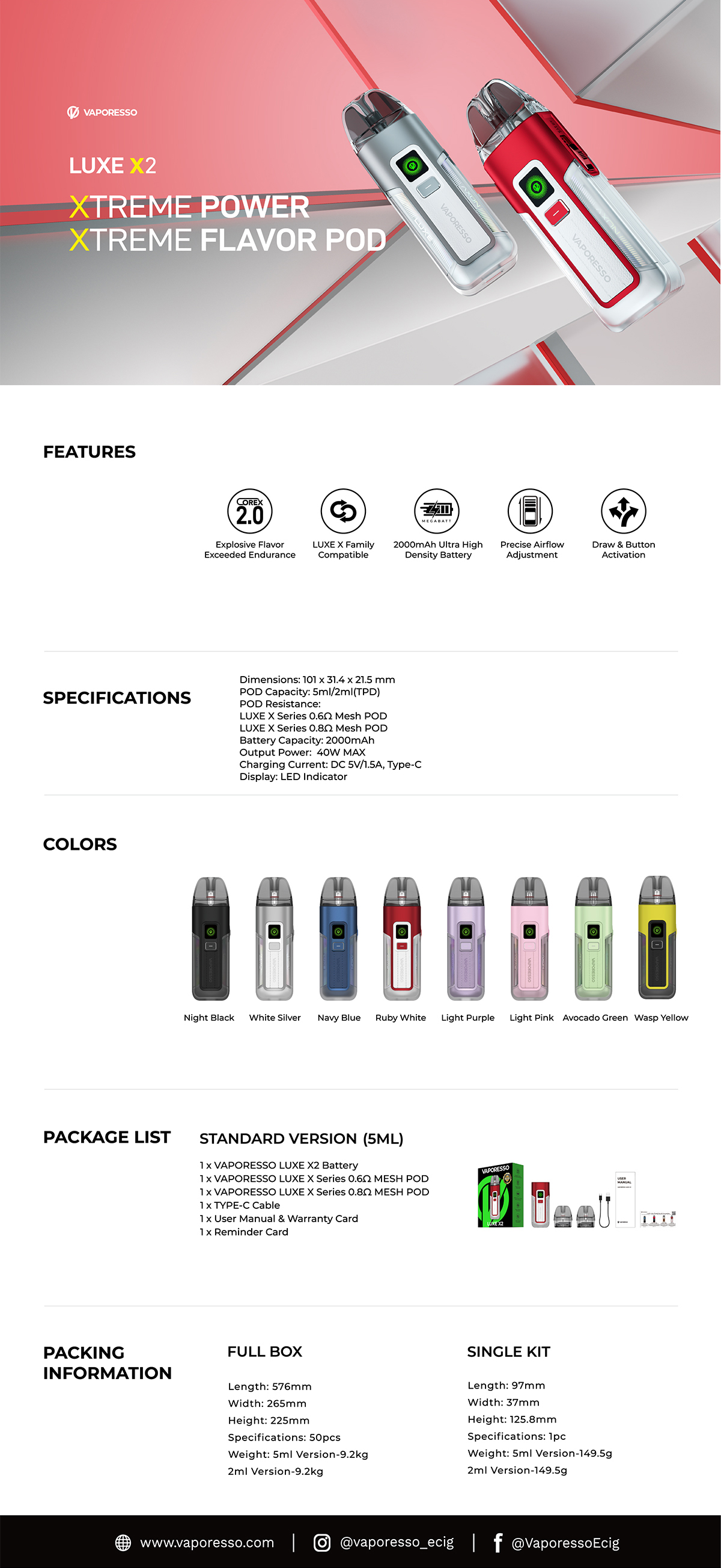 Το LUXE X2 είναι η πρώτη συσκευή MTL της σειράς LUXE X με εξαιρετικά μεγάλη χωρητικότητα μπαταρίας και pods 0,6/0,8Ω. Χρησιμοποιεί την τεχνολογία COREX 2.0 για εκρηκτική γεύση και παρατεταμένη διάρκεια ζωής. Με μπαταρία 2000mAh, προσφέρει έως και 96 ώρες ατμίσματος. Η συσκευή έχει ρυθμιζόμενη ροή αέρα και είναι συμβατή